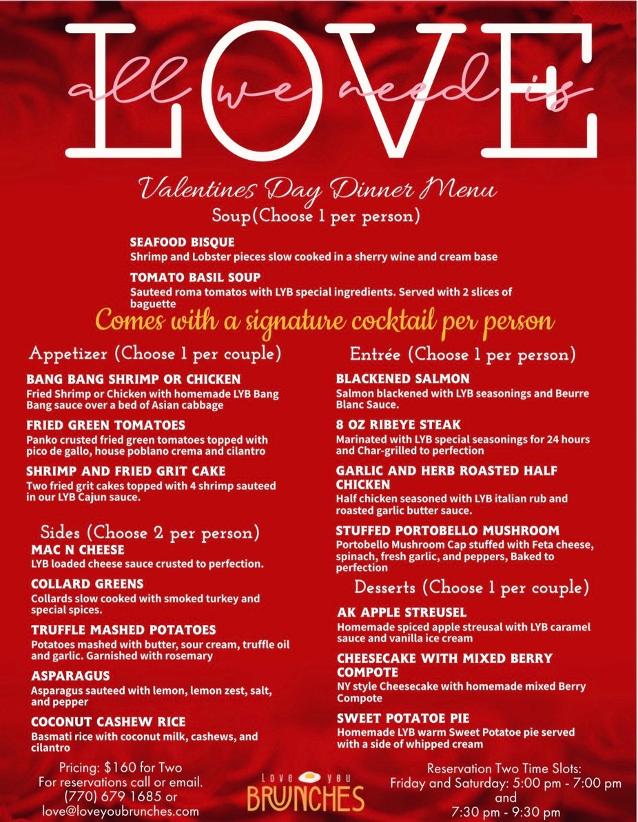 Join us on Valentine's Day for the perfect romantic evening! Two time slots. 5:00pm to 7:00pm and 7:30pm to 9:30pm. Reservation Only.